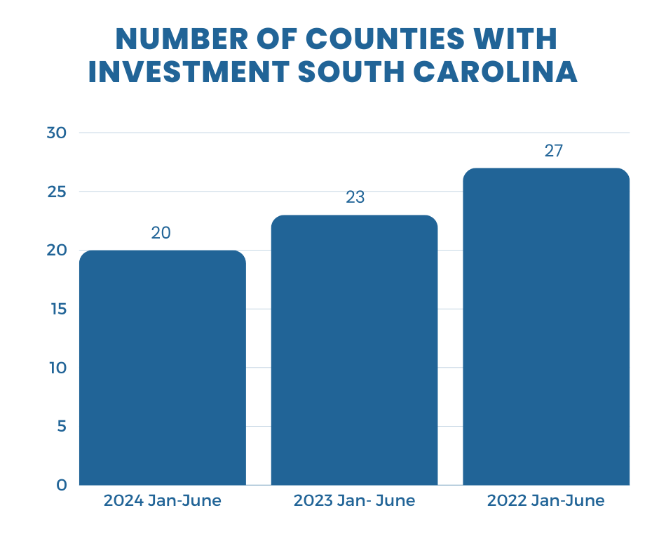 The projects are spread across the state. Nearly half of South Carolina’s 46 counties have had an announcement this year. Charleston County has the highest number of announcements at 5, and Oconee County has had four.  However, over the last three years, the number of counties with announcements at mid-year has decreased.