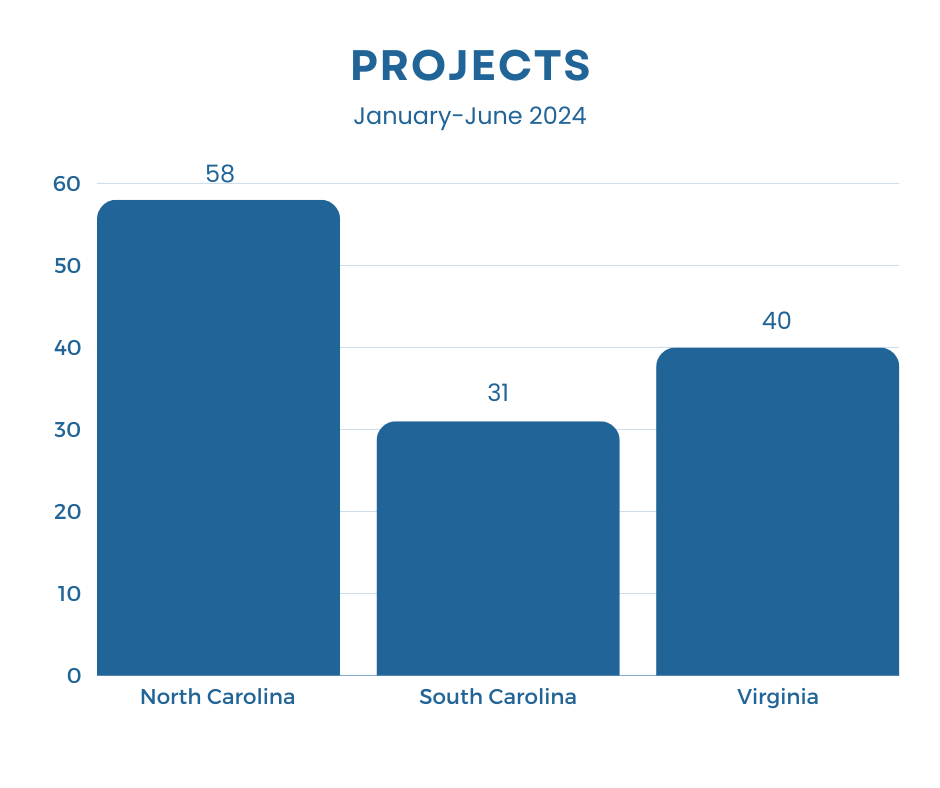 Now that we are midway through 2024, it is a good time to take stock of how things are going and spot trends. We analyzed data from NC, SC, and VA project announcement reports to see which state is leading at the halfway point in the year. The three main statistics that economic development organizations will track are projects announced, jobs created, and new capital investment. The relationship between them is correlative and not causative. However, the more projects that are announced usually means more jobs are created and more investments in capital.